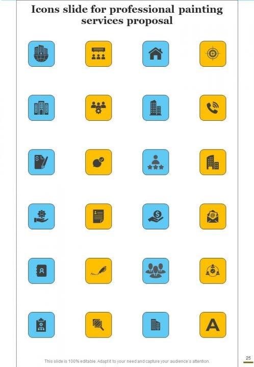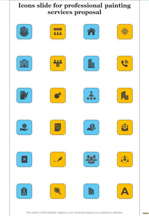 Presenting you an exemplary Icons Slide For Professional Painting Services Proposal One Pager Sample Example Document. Our one-pager comprises all the must-have essentials of an inclusive document. You can edit it with ease, as its layout is completely editable. With such freedom, you can tweak its design and other elements to your requirements. Download this Icons Slide For Professional Painting Services Proposal One Pager Sample Example Document brilliant piece now.