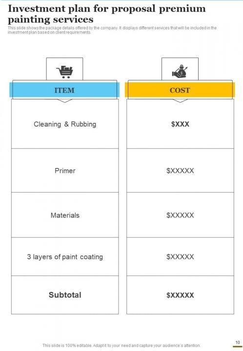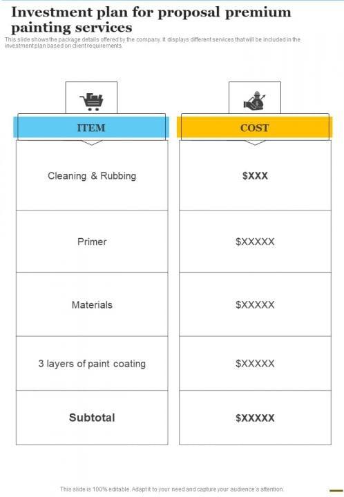 Presenting you an exemplary Investment Plan For Proposal Premium Painting Services One Pager Sample Example Document. Our one-pager comprises all the must-have essentials of an inclusive document. You can edit it with ease, as its layout is completely editable. With such freedom, you can tweak its design and other elements to your requirements. Download this Investment Plan For Proposal Premium Painting Services One Pager Sample Example Document brilliant piece now.