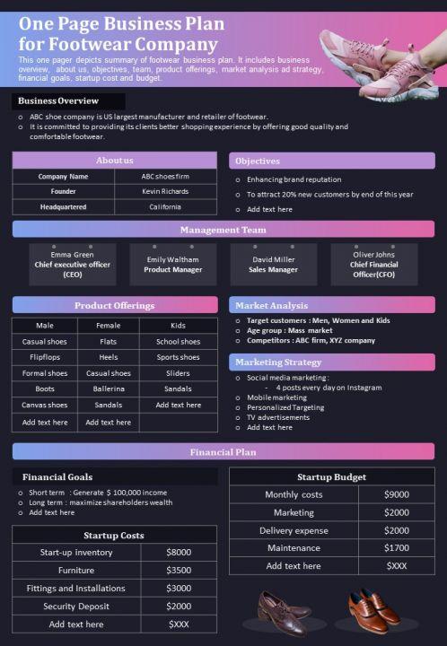 Here we present the One Page Business Plan For Footwear Company PDF Document PPT Template. This One-pager template includes everything you require. You can edit this document and make changes according to your needs it offers complete freedom of customization. Grab this One Page Business Plan For Footwear Company PDF Document PPT Template Download now.