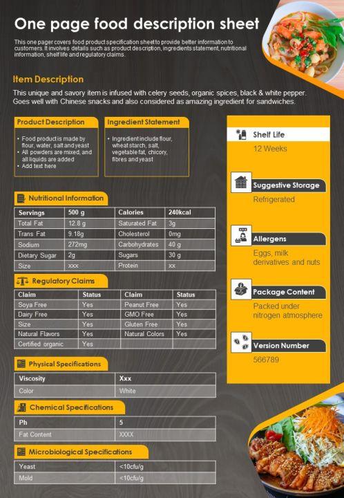 Here we present the One Page Food Description Sheet PDF Document PPT Template. This One-pager template includes everything you require. You can edit this document and make changes according to your needs it offers complete freedom of customization. Grab this One Page Food Description Sheet PDF Document PPT Template Download now.