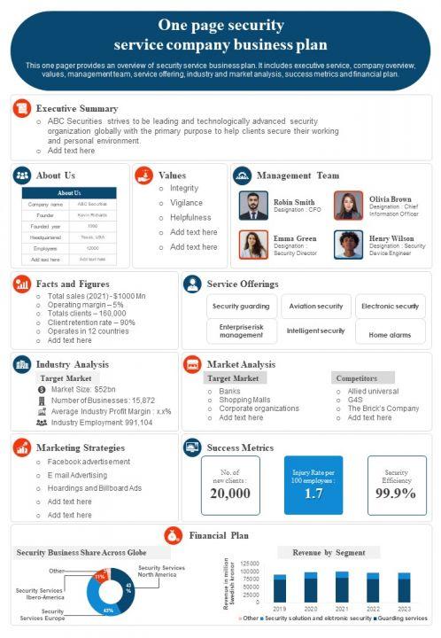 Presenting you an exemplary One Page Security Service Company Business Plan PDF Document PPT Template. Our one-pager template comprises all the must-have essentials of an inclusive document. You can edit it with ease, as its layout is completely editable. With such freedom, you can tweak its design and other elements to your requirements. Download this One Page Security Service Company Business Plan PDF Document PPT Template Download now.