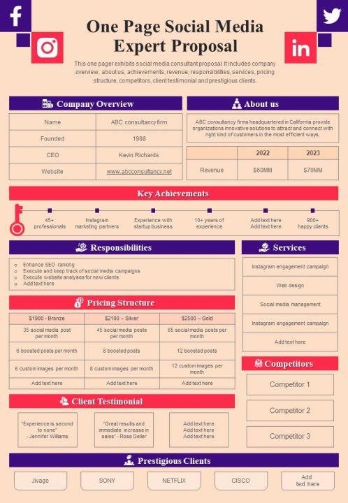 Looking for a predesigned One Page Social Media Expert Proposal PDF Document PPT Template Heres the perfect piece for you It has everything that a well-structured one-pager template should have. Besides, it is 100 percent editable, which offers you the cushion to make adjustments according to your preferences. Grab this One Page Social Media Expert Proposal PDF Document PPT Template Download now.