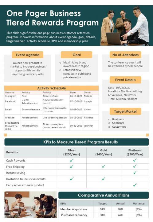 Presenting you a fantastic One Pager Business Tiered Rewards Program PDF Document PPT Template. This one-pager document is crafted on hours of research and professional design efforts to ensure you have the best resource. It is completely editable and its design allow you to rehash its elements to suit your needs. Get this One Pager Business Tiered Rewards Program PDF Document PPT Template Download now.