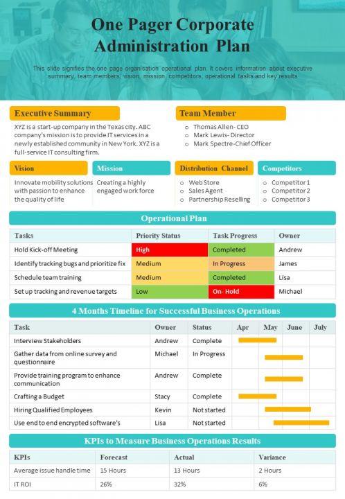 Here an illustrative One Pager Corporate Administration Plan PDF Document PPT Template. This one-pager template is designed to match your needs. It is 100 percent editable, which allows you to make changes as you seem fit to suit your purpose. Grab this One Pager Corporate Administration Plan PDF Document PPT Template Download now.