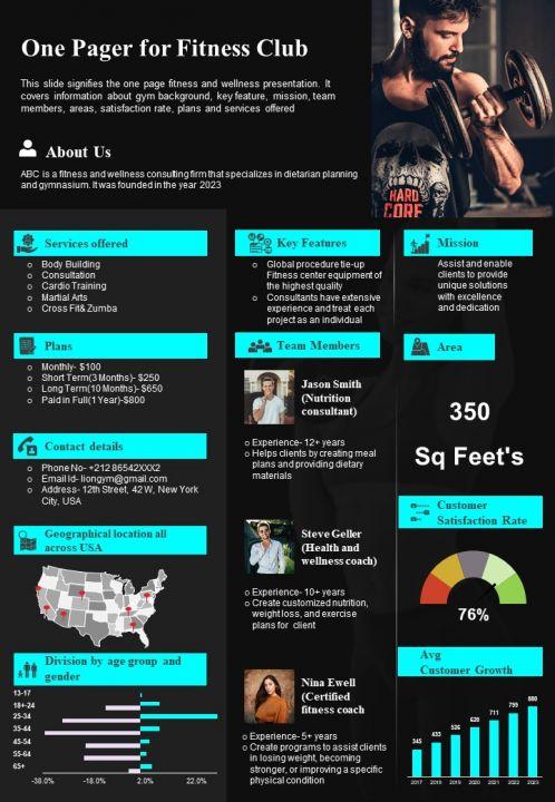 Presenting you an exemplary One Pager For Fitness Club PDF Document PPT Template. Our one-pager template comprises all the must-have essentials of an inclusive document. You can edit it with ease, as its layout is completely editable. With such freedom, you can tweak its design and other elements to your requirements. Download this One Pager For Fitness Club PDF Document PPT Template Download now.