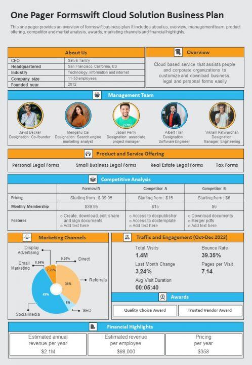 Looking for a predesigned One Pager Formswift Cloud Solution Business Plan PDF Document PPT Template Heres the perfect piece for you It has everything that a well-structured one-pager template should have. Besides, it is 100 percent editable, which offers you the cushion to make adjustments according to your preferences. Grab this One Pager Formswift Cloud Solution Business Plan PDF Document PPT Template Download now.