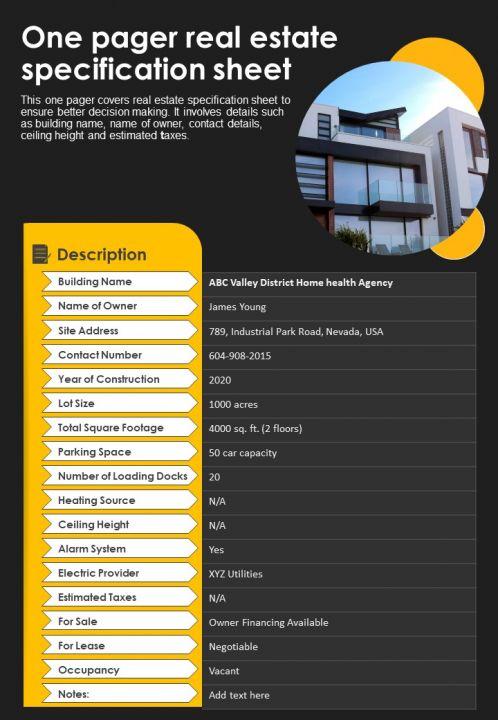 Heres a predesigned One Pager Real Estate Specification Sheet PDF Document PPT Template for you. Built on extensive research and analysis, this one-pager template has all the centerpieces of your specific requirements. This temple exudes brilliance and professionalism. Being completely editable, you can make changes to suit your purpose. Get this One Pager Real Estate Specification Sheet PDF Document PPT Template Download now.