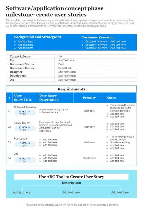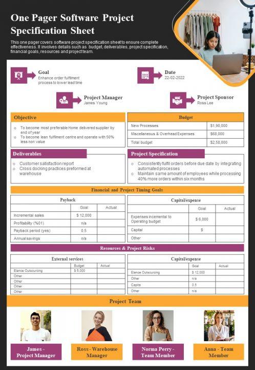 Looking for a predesigned One Pager Software Project Specification Sheet PDF Document PPT Template Heres the perfect piece for you It has everything that a well-structured one-pager template should have. Besides, it is 100 percent editable, which offers you the cushion to make adjustments according to your preferences. Grab this One Pager Software Project Specification Sheet PDF Document PPT Template Download now.