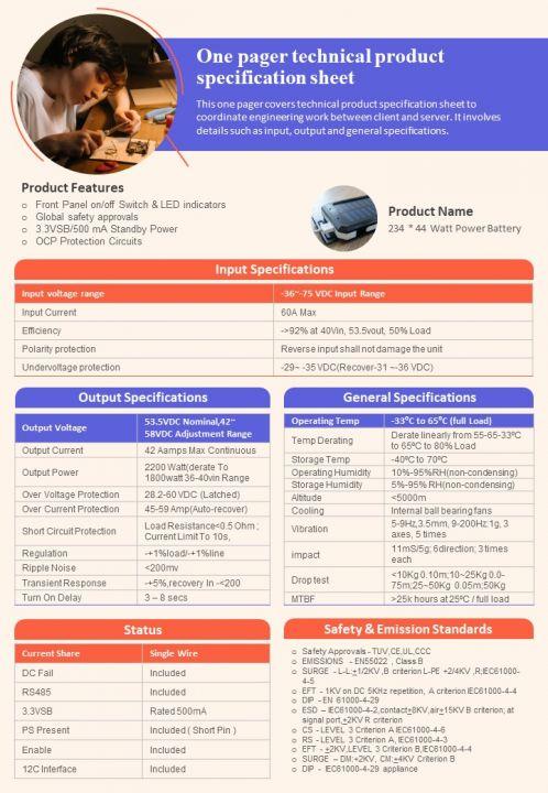 Presenting you a fantastic One Pager Technical Product Specification Sheet PDF Document PPT Template. This one-pager document is crafted on hours of research and professional design efforts to ensure you have the best resource. It is completely editable and its design allow you to rehash its elements to suit your needs. Get this One Pager Technical Product Specification Sheet PDF Document PPT Template Download now.