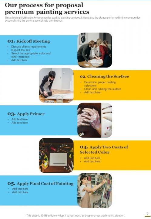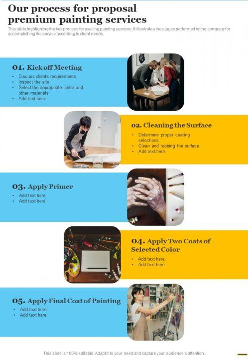 Presenting you an exemplary Our Process For Proposal Premium Painting Services One Pager Sample Example Document. Our one-pager comprises all the must-have essentials of an inclusive document. You can edit it with ease, as its layout is completely editable. With such freedom, you can tweak its design and other elements to your requirements. Download this Our Process For Proposal Premium Painting Services One Pager Sample Example Document brilliant piece now.