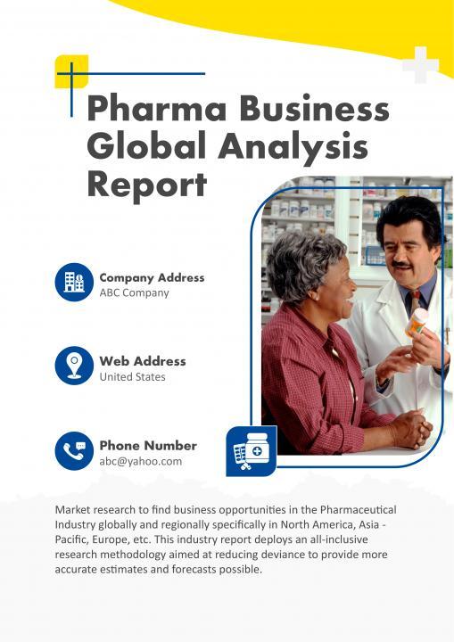 This Pharma Business Global Analysis Report Pdf Word Document is a primer on how to capitalize on business opportunities through planning, innovation, and market intelligence. The content-ready format of the complete deck will make your job as a decision-maker a lot easier. Use this ready-made PowerPoint Template to help you outline an extensive and legible plan to capture markets and grow your company on the right path, at an exponential pace. What is even more amazing is that this presentation is completely editable and 100 percent customizable. This ninety eight slide complete deck helps you impress a roomful of people with your expertise in business and even presentation. Craft such a professional and appealing presentation for that amazing recall value. Download now.