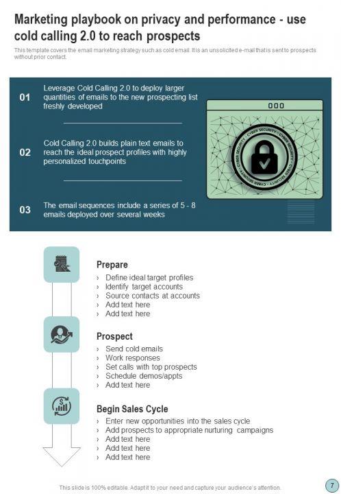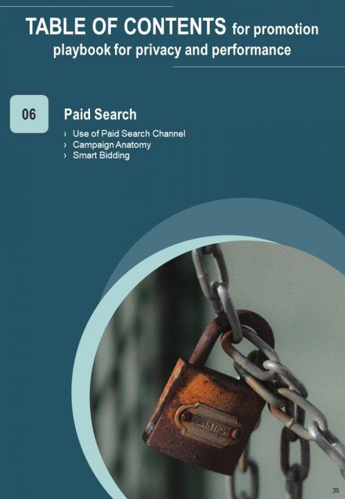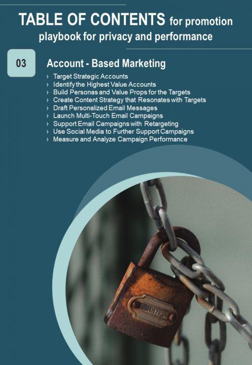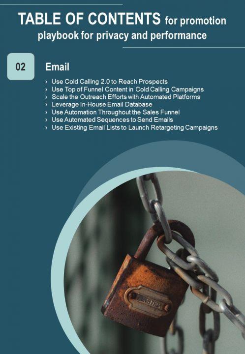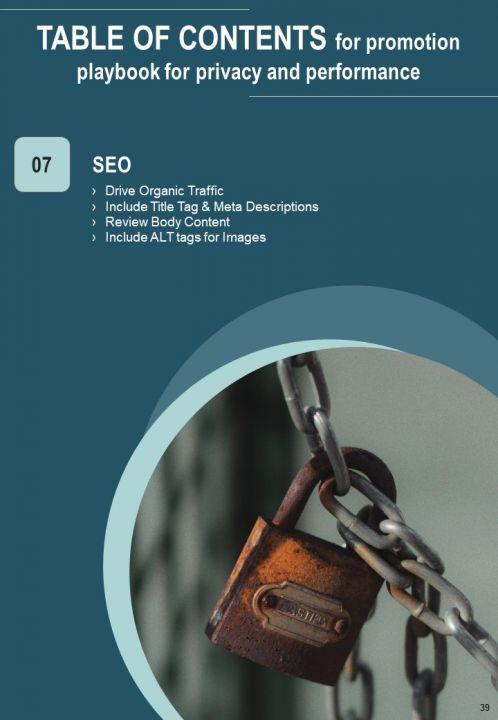 Create winning presentations effortlessly with our Promotion Playbook For Privacy And Performance Template. Designed to impress, each template is 100 percent editable, visually-stunning, and easy-to-use. Our team of researchers has meticulously crafted the right content for each template, so you do not have to worry about anything. Just select the perfect template for your project, personalize it, and deliver a memorable presentation that leaves a lasting impact.