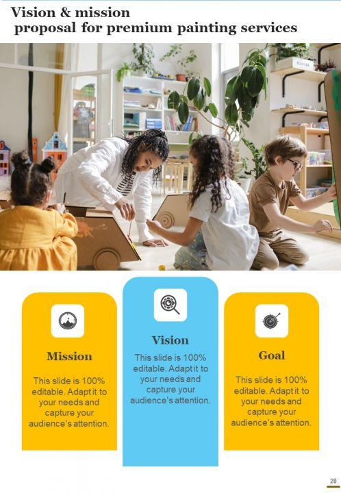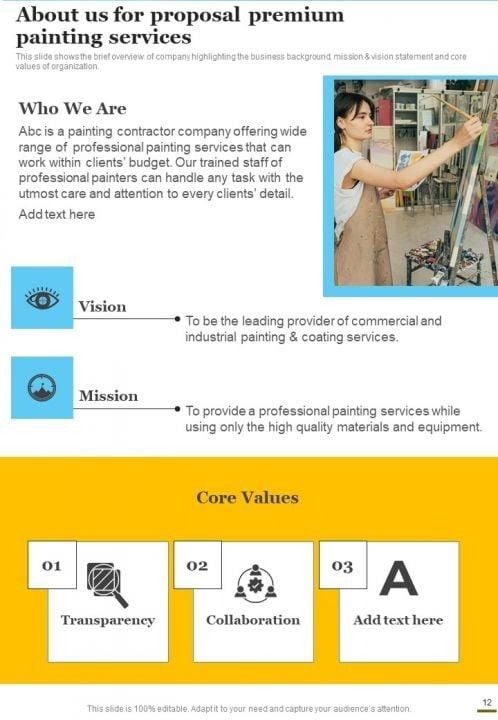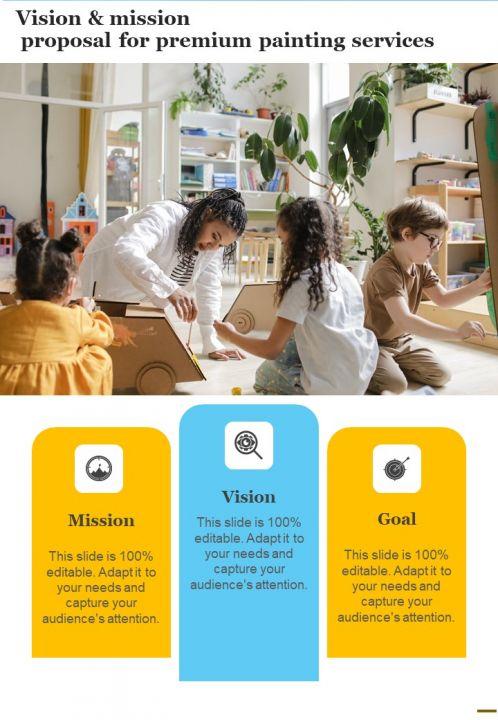 Presenting you an exemplary Vision And Mission Proposal For Premium Painting Services One Pager Sample Example Document. Our one-pager comprises all the must-have essentials of an inclusive document. You can edit it with ease, as its layout is completely editable. With such freedom, you can tweak its design and other elements to your requirements. Download this Vision And Mission Proposal For Premium Painting Services One Pager Sample Example Document brilliant piece now.