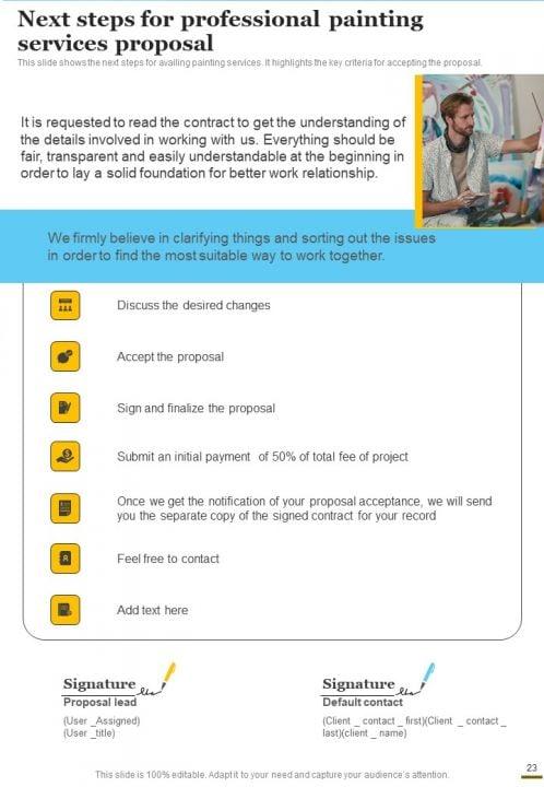 Presenting you an exemplary Next Steps For Professional Painting Services Proposal One Pager Sample Example Document. Our one-pager comprises all the must-have essentials of an inclusive document. You can edit it with ease, as its layout is completely editable. With such freedom, you can tweak its design and other elements to your requirements. Download this Next Steps For Professional Painting Services Proposal One Pager Sample Example Document brilliant piece now.