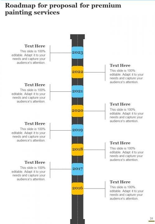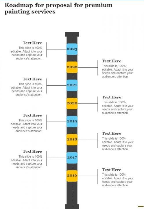 Presenting you an exemplary Roadmap For Proposal For Premium Painting Services One Pager Sample Example Document. Our one-pager comprises all the must-have essentials of an inclusive document. You can edit it with ease, as its layout is completely editable. With such freedom, you can tweak its design and other elements to your requirements. Download this Roadmap For Proposal For Premium Painting Services One Pager Sample Example Document brilliant piece now.
