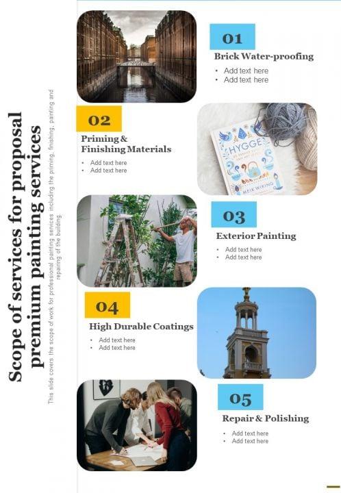 Presenting you an exemplary Scope Of Services For Proposal Premium Painting Services One Pager Sample Example Document. Our one-pager comprises all the must-have essentials of an inclusive document. You can edit it with ease, as its layout is completely editable. With such freedom, you can tweak its design and other elements to your requirements. Download this Scope Of Services For Proposal Premium Painting Services One Pager Sample Example Document brilliant piece now.