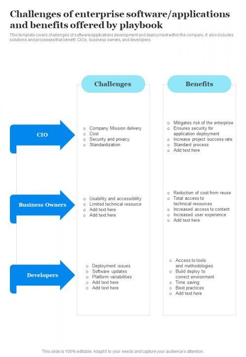 Create eye-catching presentations that stand out with our Software Development And Deployment Playbook Template. Each template is 100 percent editable, so you can personalize each slide to fit your unique style and content. Our team of experts has crafted each template with care, ensuring that you have everything you need to create a visually-stunning and engaging presentation.