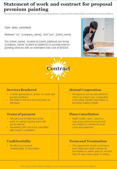 Presenting you an exemplary Statement Of Work And Contract For Proposal Premium Painting One Pager Sample Example Document. Our one-pager comprises all the must-have essentials of an inclusive document. You can edit it with ease, as its layout is completely editable. With such freedom, you can tweak its design and other elements to your requirements. Download this Statement Of Work And Contract For Proposal Premium Painting One Pager Sample Example Document brilliant piece now.