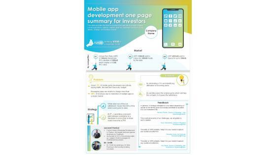 Boost your pitch with our creative Mobile App Development One Page Summary For Investors. Deliver an awe-inspiring pitch that will mesmerize everyone. Using these presentation templates you will surely catch everyones attention. You can browse the ppts collection on our website. We have researchers who are experts at creating the right content for the templates. So you do not have to invest time in any additional work. Just grab the template now and use them.