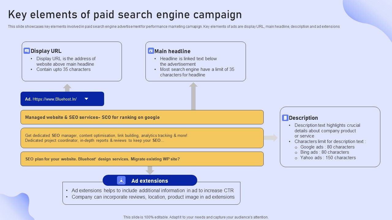 This slide showcases key elements involved in paid search engine advertisement for performance marketing camapign. Key elements of ads are display URL, main headline, description and ad extensions This modern and well-arranged Online Marketing Strategy For Lead Generation Key Elements Of Paid Search Engine Campaign Microsoft PDF provides lots of creative possibilities. It is very simple to customize and edit with the Powerpoint Software. Just drag and drop your pictures into the shapes. All facets of this template can be edited with Powerpoint, no extra software is necessary. Add your own material, put your images in the places assigned for them, adjust the colors, and then you can show your slides to the world, with an animated slide included.