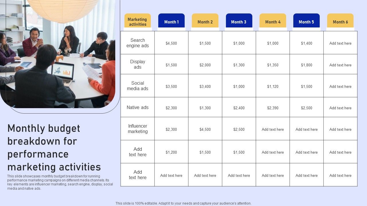Online Marketing Strategy For Lead Generation Monthly Budget Breakdown For Performance Marketing Activities Designs PDF with all 9 slides: