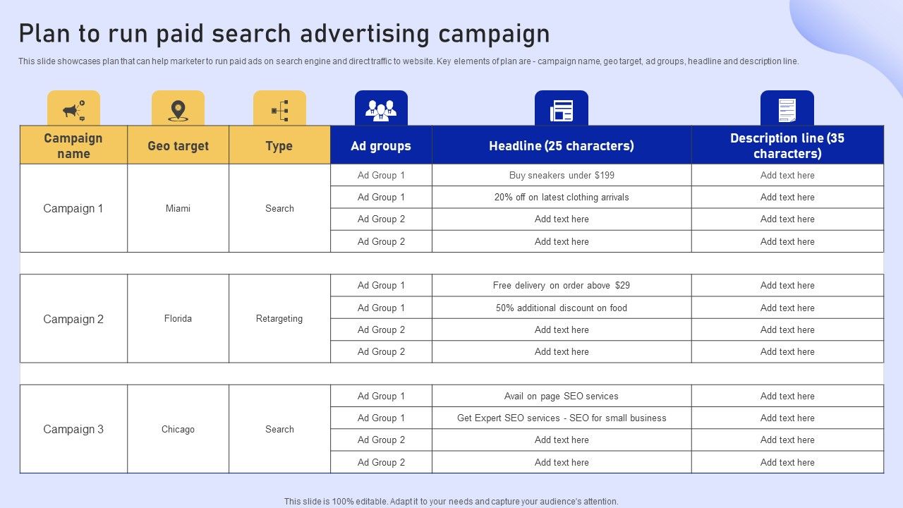 This slide showcases plan that can help marketer to run paid ads on search engine and direct traffic to website. Key elements of plan are - campaign name, geo target, ad groups, headline and description line. Want to ace your presentation in front of a live audience Our Online Marketing Strategy For Lead Generation Plan To Run Paid Search Advertising Campaign Topics PDF can help you do that by engaging all the users towards you.. Slidegeeks experts have put their efforts and expertise into creating these impeccable powerpoint presentations so that you can communicate your ideas clearly. Moreover, all the templates are customizable, and easy-to-edit and downloadable. Use these for both personal and commercial use.