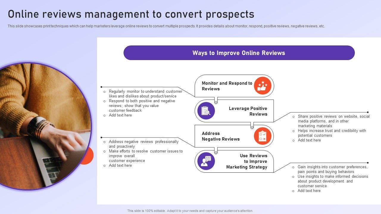 This slide showcases print techniques which can help marketers leverage online reviews to convert multiple prospects. It provides details about monitor, respond, positive reviews, negative reviews, etc. Present like a pro with Online Reviews Management To Convert Prospects Clipart PDF Create beautiful presentations together with your team, using our easy to use presentation slides. Share your ideas in real time and make changes on the fly by downloading our templates. So whether you are in the office, on the go, or in a remote location, you can stay in sync with your team and present your ideas with confidence. With Slidegeeks presentation got a whole lot easier. Grab these presentations today.