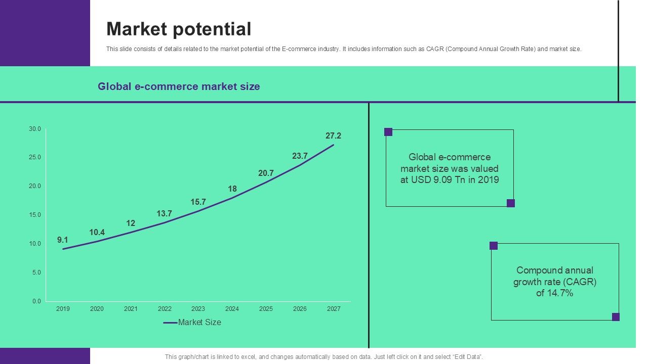 This slide consists of details related to the market potential of the E commerce industry. It includes information such as CAGR Compound Annual Growth Rate and market size. This Online Store Investment Pitch Deck Market Potential Topics PDF is perfect for any presentation, be it in front of clients or colleagues. It is a versatile and stylish solution for organizing your meetings. The Online Store Investment Pitch Deck Market Potential Topics PDF features a modern design for your presentation meetings. The adjustable and customizable slides provide unlimited possibilities for acing up your presentation. Slidegeeks has done all the homework before launching the product for you. So, do not wait, grab the presentation templates today
