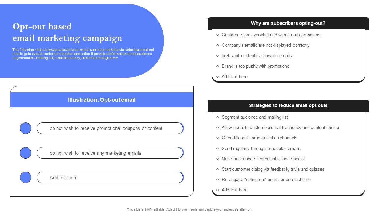 The following slide showcases techniques which can help marketers in reducing email opt-outs to gain overall customer retention and sales. It provides information about audience segmentation, mailing list, email frequency, customer dialogue, etc. Do you have to make sure that everyone on your team knows about any specific topic I yes, then you should give OPT Out Based Email Marketing Campaign Ppt PowerPoint Presentation Diagram PDF a try. Our experts have put a lot of knowledge and effort into creating this impeccable OPT Out Based Email Marketing Campaign Ppt PowerPoint Presentation Diagram PDF. You can use this template for your upcoming presentations, as the slides are perfect to represent even the tiniest detail. You can download these templates from the Slidegeeks website and these are easy to edit. So grab these today.