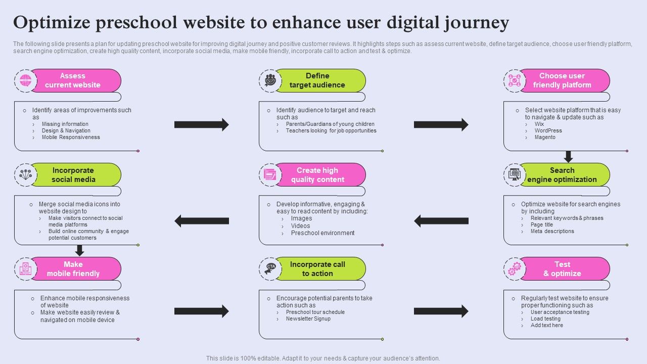 The following slide presents a plan for updating preschool website for improving digital journey and positive customer reviews. It highlights steps such as assess current website, define target audience, choose user friendly platform, search engine optimization, create high quality content, incorporate social media, make mobile friendly, incorporate call to action and test and optimize. Find a pre designed and impeccable Optimize Preschool Website To Enhance User Digital Journey Brochure PDF. The templates can ace your presentation without additional effort. You can download these easy to edit presentation templates to make your presentation stand out from others. So, what are you waiting for Download the template from Slidegeeks today and give a unique touch to your presentation.