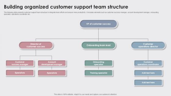 The following slide presents customer support team structure to integrate team efforts and ensure more productivity. It includes elements such as customer success manager, account development manager, onboarding specialist, operations coordinator etc. Get a simple yet stunning designed Building Organized Customer Support Improving Customer Retention PPT Template. It is the best one to establish the tone in your meetings. It is an excellent way to make your presentations highly effective. So, download this PPT today from Slidegeeks and see the positive impacts. Our easy-to-edit Building Organized Customer Support Improving Customer Retention PPT Template can be your go-to option for all upcoming conferences and meetings. So, what are you waiting for Grab this template today.