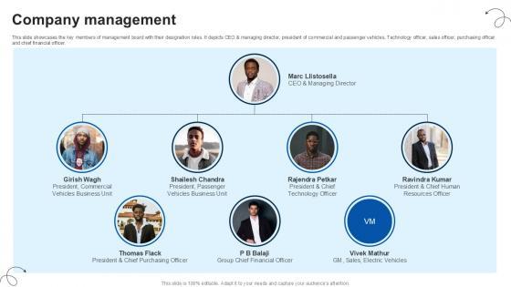 This slide showcases the key members of management board with their designation roles. It depicts CEO and managing director, president of commercial and passenger vehicles, Technology officer, sales officer, purchasing officer and chief financial officer. Present like a pro with Company Management Luxury Automobile Vehicles PPT Example CP SS V. Create beautiful presentations together with your team, using our easy-to-use presentation slides. Share your ideas in real-time and make changes on the fly by downloading our templates. So whether you are in the office, on the go, or in a remote location, you can stay in sync with your team and present your ideas with confidence. With Slidegeeks presentation got a whole lot easier. Grab these presentations today.
