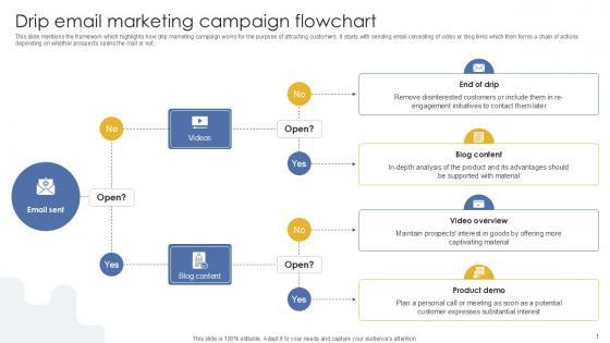 This slide mentions the framework which highlights how drip marketing campaign works for the purpose of attracting customers. It starts with sending email consisting of video or blog links which then forms a chain of actions depending on whether prospects opens the mail or not. From laying roadmaps to briefing everything in detail, our templates are perfect for you. You can set the stage with your presentation slides. All you have to do is download these easy-to-edit and customizable templates. Drip Email Marketing Campaign Flowchart PPT Slide MKT SS V will help you deliver an outstanding performance that everyone would remember and praise you for. Do download this presentation today.