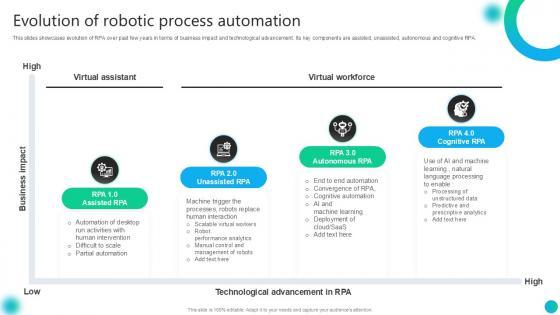 This slides showcases evolution of RPA over past few years in terms of business impact and technological advancement. Its key components are assisted, unassisted, autonomous and cognitive RPA. If your project calls for a presentation, then Slidegeeks is your go-to partner because we have professionally designed, easy-to-edit templates that are perfect for any presentation. After downloading, you can easily edit Evolution Of Robotic Process Automation PPT Slide AI SS V and make the changes accordingly. You can rearrange slides or fill them with different images. Check out all the handy templates