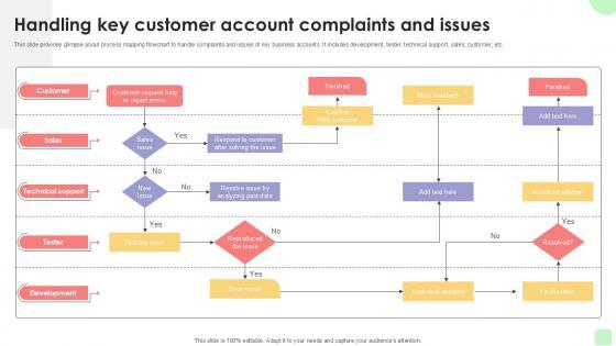 This slide provides glimpse about process mapping flowchart to handle complaints and issues of key business accounts. It includes development, tester, technical support, sales, customer, etc. Step up your game with our enchanting Handling Key Customer Detailed Business Account PPT Template Strategy SS V deck, guaranteed to leave a lasting impression on your audience. Crafted with a perfect balance of simplicity, and innovation, our deck empowers you to alter it to your specific needs. You can also change the color theme of the slide to mold it to your companys specific needs. Save time with our ready-made design, compatible with Microsoft versions and Google Slides. Additionally, its available for download in various formats including JPG, JPEG, and PNG. Outshine your competitors with our fully editable and customized deck.