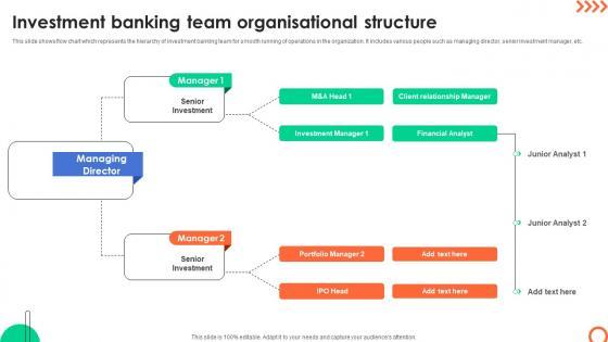 This slide shows flow chart which represents the hierarchy of investment banking team for smooth running of operations in the organization. It includes various people such as managing director, senior investment manager, etc. The Investment Banking Team Organisational Understanding Investment Banking Framework Fin SS V is a compilation of the most recent design trends as a series of slides. It is suitable for any subject or industry presentation, containing attractive visuals and photo spots for businesses to clearly express their messages. This template contains a variety of slides for the user to input data, such as structures to contrast two elements, bullet points, and slides for written information. Slidegeeks is prepared to create an impression.