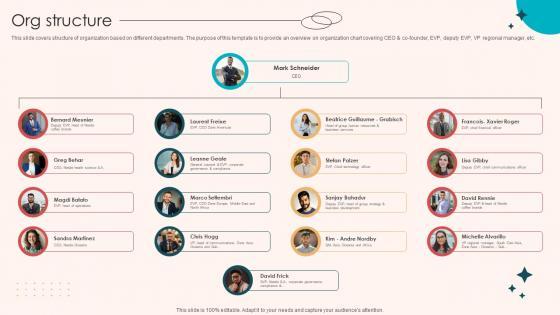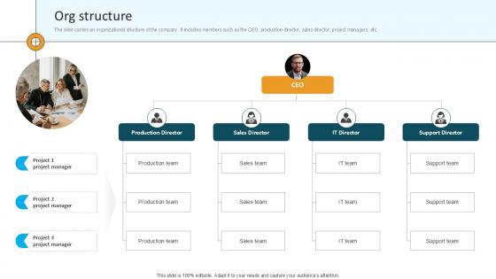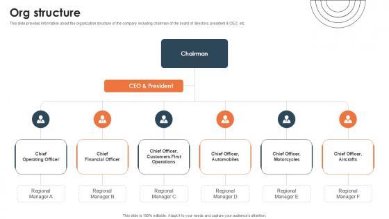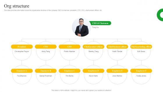 This slide provides information about the organization structure of the company CEO and chairman, president, CTO, CFO, chief product officer, etc. From laying roadmaps to briefing everything in detail, our templates are perfect for you. You can set the stage with your presentation slides. All you have to do is download these easy to edit and customizable templates. Org Structure Food Delivery Platform Investor Funding Elevator Pitch Deck PPT Template will help you deliver an outstanding performance that everyone would remember and praise you for. Do download this presentation today.
