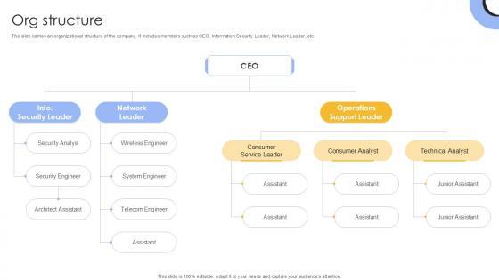 The slide carries an organizational structure of the company. It includes members such as CEO, Information Security Leader, Network Leader, etc. From laying roadmaps to briefing everything in detail, our templates are perfect for you. You can set the stage with your presentation slides. All you have to do is download these easy-to-edit and customizable templates. Org Structure Investment Company Investor Funding Elevator Ppt Presentation will help you deliver an outstanding performance that everyone would remember and praise you for. Do download this presentation today.