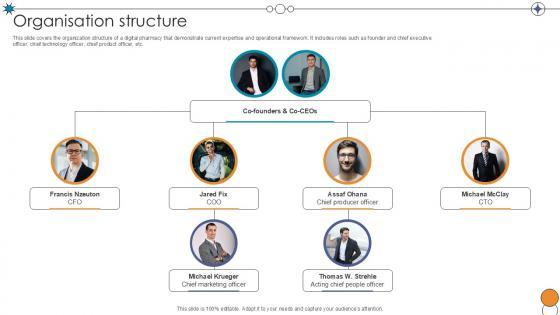 This slide covers the organization structure of a digital pharmacy that demonstrate current expertise and operational framework. It includes roles such as founder and chief executive officer, chief technology officer, chief product officer, etc. Do you know about Slidesgeeks Organisation Structure Digital Pharmacy Company Investor Funding Ppt Slide These are perfect for delivering any kind od presentation. Using it, create PowerPoint presentations that communicate your ideas and engage audiences. Save time and effort by using our pre-designed presentation templates that are perfect for a wide range of topic. Our vast selection of designs covers a range of styles, from creative to business, and are all highly customizable and easy to edit. Download as a PowerPoint template or use them as Google Slides themes.