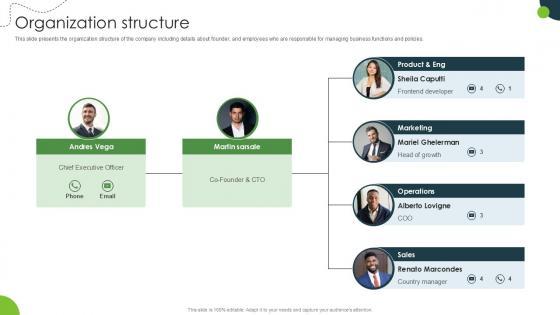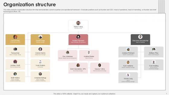 This slide presents organization structure firm that demonstrates current expertise and operational framework. It includes positions such as founder and CEO, head of operations, head of marketing, co-founder and chief technological officer, etc. Crafting an eye-catching presentation has never been more straightforward. Let your presentation shine with this tasteful yet straightforward Organization Structure Communication Tech Company Pitch Deck PPT Slide template. It offers a minimalistic and classy look that is great for making a statement. The colors have been employed intelligently to add a bit of playfulness while still remaining professional. Construct the ideal Organization Structure Communication Tech Company Pitch Deck PPT Slide that effortlessly grabs the attention of your audience Begin now and be certain to wow your customers