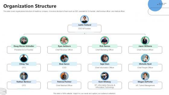 This slide covers organizational structure of HealthJoy company. It involves structure of team such as CEO, president and Co founder, chief revenue officer and medical officer. This Organization Structure Medical Benefits Navigation Platform Pitch Deck Ppt Powerpoint from Slidegeeks makes it easy to present information on your topic with precision. It provides customization options, so you can make changes to the colors, design, graphics, or any other component to create a unique layout. It is also available for immediate download, so you can begin using it right away. Slidegeeks has done good research to ensure that you have everything you need to make your presentation stand out. Make a name out there for a brilliant performance.