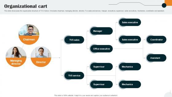 This slide showcases the organization structure of TVS motors. It includes chairman, managing director, director, Tvs sales and service, manger, executives, supervisor, sales executives, mechanics, coordinator and assistant. Explore a selection of the finest Organizational Cart Vehicle Manufacturer Company Profile PPT Sample CP SS V here. With a plethora of professionally designed and pre-made slide templates, you can quickly and easily find the right one for your upcoming presentation. You can use our Organizational Cart Vehicle Manufacturer Company Profile PPT Sample CP SS V to effectively convey your message to a wider audience. Slidegeeks has done a lot of research before preparing these presentation templates. The content can be personalized and the slides are highly editable. Grab templates today from Slidegeeks.