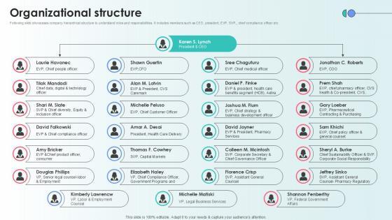 Following slide showcases company hierarchical structure to understand roles and responsibilities. It includes members such as CEO, president, EVP, SVP,, chief compliance officer etc. Are you in need of a template that can accommodate all of your creative concepts This one is crafted professionally and can be altered to fit any style. Use it with Google Slides or PowerPoint. Include striking photographs, symbols, depictions, and other visuals. Fill, move around, or remove text boxes as desired. Test out color palettes and font mixtures. Edit and save your work, or work with colleagues. Download Organizational Structure Capital Raising Pitch Deck For Health Care Services Ppt Slide and observe how to make your presentation outstanding. Give an impeccable presentation to your group and make your presentation unforgettable.
