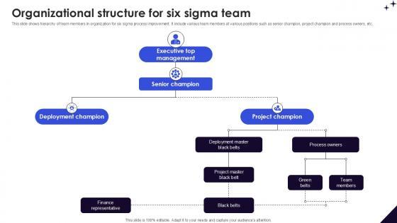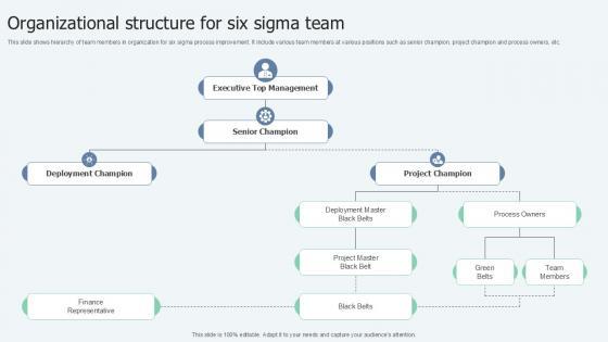 This slide shows hierarchy of team members in organization for six sigma process improvement. It include various team members at various positions such as senior champion, project champion and process owners, etc. Explore a selection of the finest Organizational Structure For Six DMAIC Methodology To Maintain PPT Slide here. With a plethora of professionally designed and pre-made slide templates, you can quickly and easily find the right one for your upcoming presentation. You can use our Organizational Structure For Six DMAIC Methodology To Maintain PPT Slide to effectively convey your message to a wider audience. Slidegeeks has done a lot of research before preparing these presentation templates. The content can be personalized and the slides are highly editable. Grab templates today from Slidegeeks.