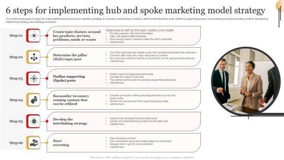 This slide showcases 6 steps for implementing hub and spoke marketing strategy. It includes creating topic clusters, determining the pillar post, outlining supporting posts, reconsidering inventory existing content, developing interlinking strategy and strategy execution. Presenting 6 Steps For Implementing Hub And Spoke Marketing Model Strategy Template PDF to dispense important information. This template comprises six stages. It also presents valuable insights into the topics including Services, Problems, Determine The Pillar, Outline Supporting Posts, Start Executing. This is a completely customizable PowerPoint theme that can be put to use immediately. So, download it and address the topic impactfully.