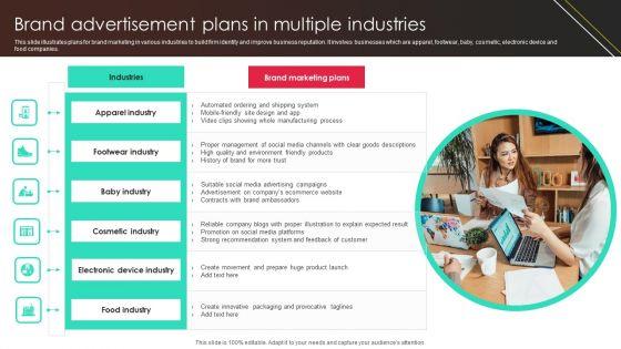 This slide illustrates plans for brand marketing in various industries to build firm identity and improve business reputation. It involves businesses which are apparel, footwear, baby, cosmetic, electronic device and food companies. Persuade your audience using this Brand Advertisement Plans In Multiple Industries Slides PDF. This PPT design covers six stages, thus making it a great tool to use. It also caters to a variety of topics including Apparel Industry, Footwear Industry, Baby Industry. Download this PPT design now to present a convincing pitch that not only emphasizes the topic but also showcases your presentation skills.