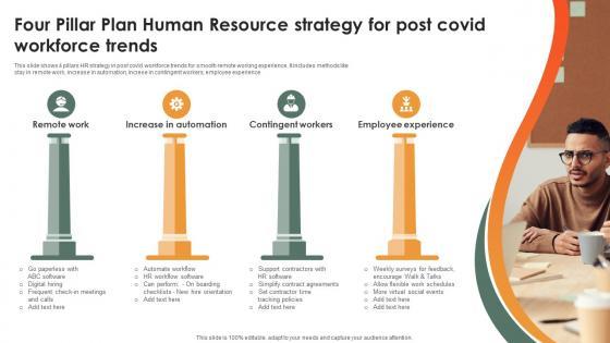 This slide shows 4 pillars HR strategy in post covid workforce trends for smooth remote working experience. It includes methods like stay in remote work, increase in automation, increse in contingent workers, employee experience. Showcasing this set of slides titled Four Pillar Plan Human Resource Strategy For Post Covid Workforce Trends Summary Pdf. The topics addressed in these templates are Remote Work,Increase Automation,Contingent Workers. All the content presented in this PPT design is completely editable. Download it and make adjustments in color, background, font etc. as per your unique business setting.