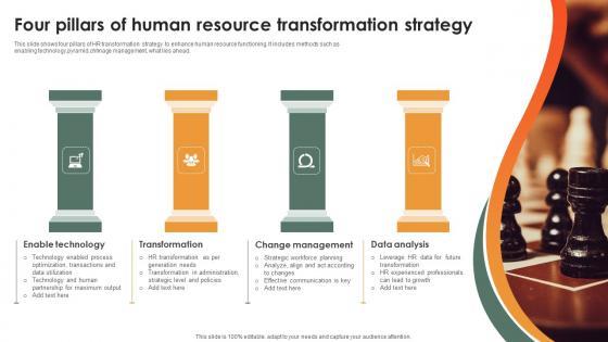 This slide shows four pillars of HR transformation strategy to enhance human resource functioning. It includes methods such as enabling technology,pyramid,chhnage management, what lies ahead. Showcasing this set of slides titled Four Pillars Of Human Resource Transformation Strategy Background Pdf. The topics addressed in these templates are Enabling Technology, Pyramid,Chhnage Management. All the content presented in this PPT design is completely editable. Download it and make adjustments in color, background, font etc. as per your unique business setting.