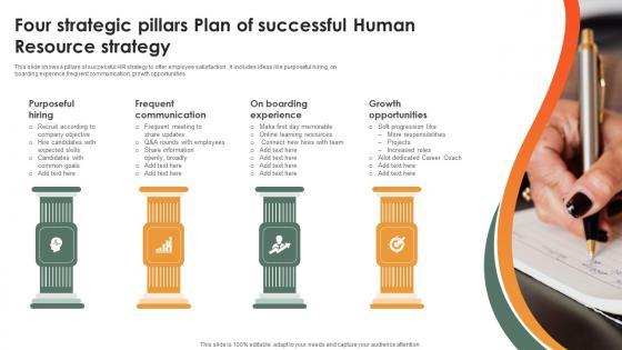 This slide shows 4 pillars of successful HR strategy to offer employee satisfaction . It includes ideas like purposeful hiring, on boarding experince,frequent communication, growth opportunities. Pitch your topic with ease and precision using this Four Strategic Pillars Plan Of Successful Human Resource Strategy Formats Pdf. This layout presents information on Boarding Experince, Frequent Communication, Growth Opportunities. It is also available for immediate download and adjustment. So, changes can be made in the color, design, graphics or any other component to create a unique layout.