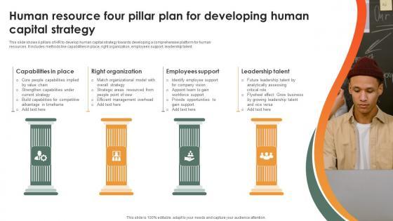This slide shows 4 pillars of HR to develop human capital strategy towards developing a comprehensive platform for human resources. It includes methods like capabilities in place, right organization, employees support, leadership talent. Showcasing this set of slides titled Human Resource Four Pillar Plan For Developing Human Capital Strategy Download Pdf. The topics addressed in these templates are Right Organization, Employees Support, Leadership Talent. All the content presented in this PPT design is completely editable. Download it and make adjustments in color, background, font etc. as per your unique business setting.